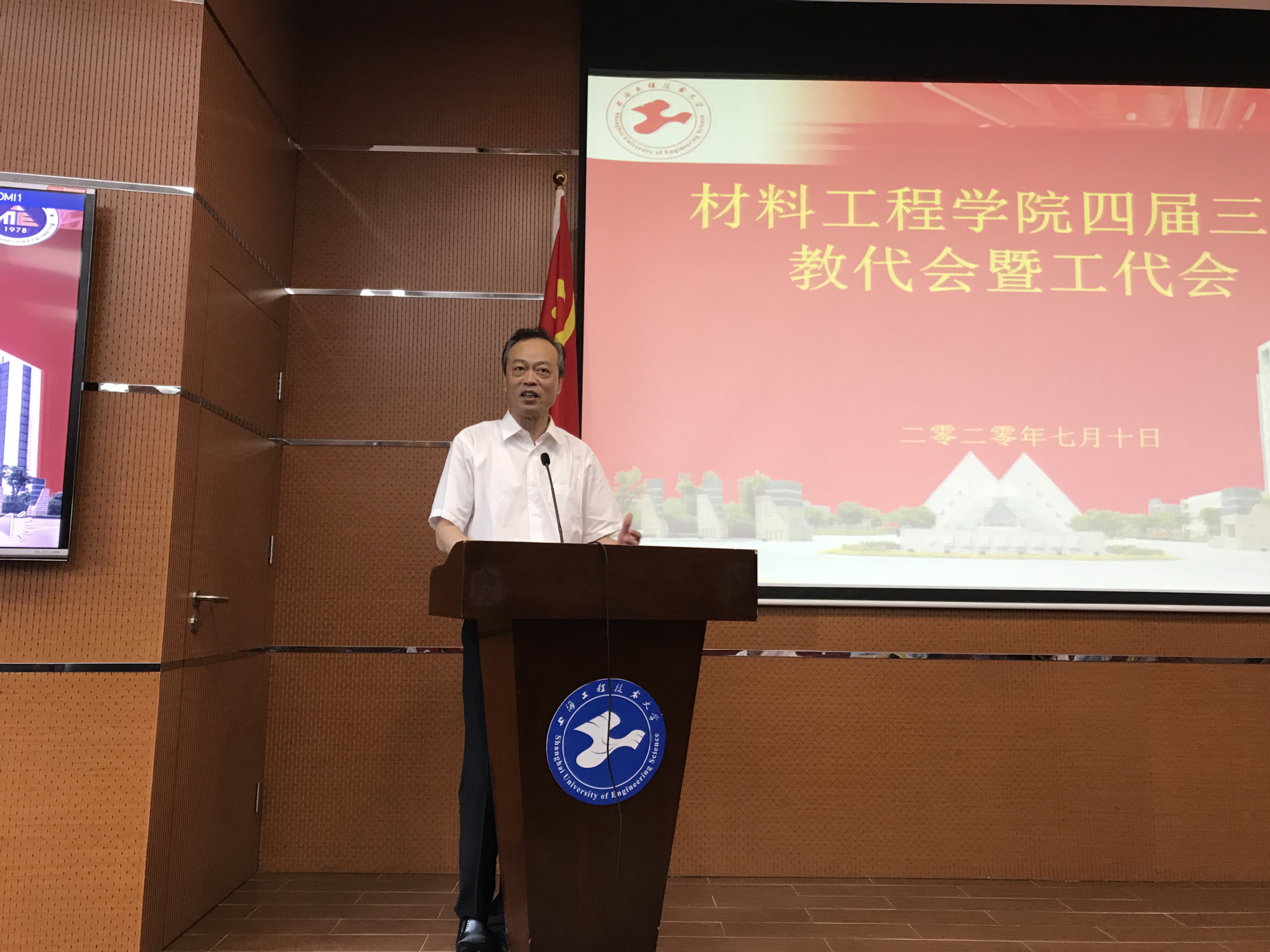 7月10日下午,材料工程学院在航飞楼一楼报告厅举行材料工程学院第四届第三次教代会暨工代会(简称“双代会”)。参加会议的有校工会常务副主席柳如荣、材料工程学院党政负责人、教代会代表、列席代表等。会议由学院工会主席冷培榆主持。