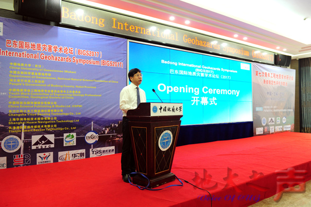 MILE米乐官网党委副书记唐辉明主持论坛开幕式并代表学校致辞,巴东县人民政府县长郭玲、国家自然科学基金委地球科学部二处主任熊巨华、国土资源部地质环境司地质灾害防治处处长李晓春分别致辞,恩施州人民政府副州长程水源宣布论坛开幕。