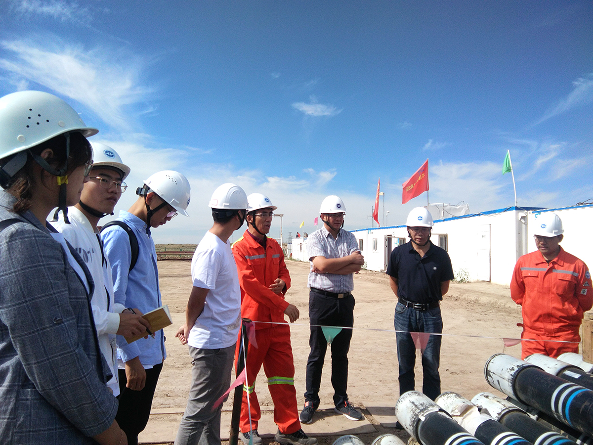 叶成明带领团队前往干热岩钻探现场参观,并对部分技术难题和现场情况进行讲解。只见现场周围是一望无边的荒地,只有一个高大的钻塔矗立其中,众多地质人、水环人为科技攻坚奉献着、奋斗着。他们这种正视困难、直面挑战、勇于攻坚克难、敢于改革创新的精神深深地感动着实践团队的每一个成员。