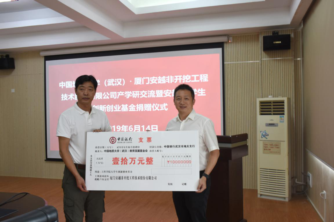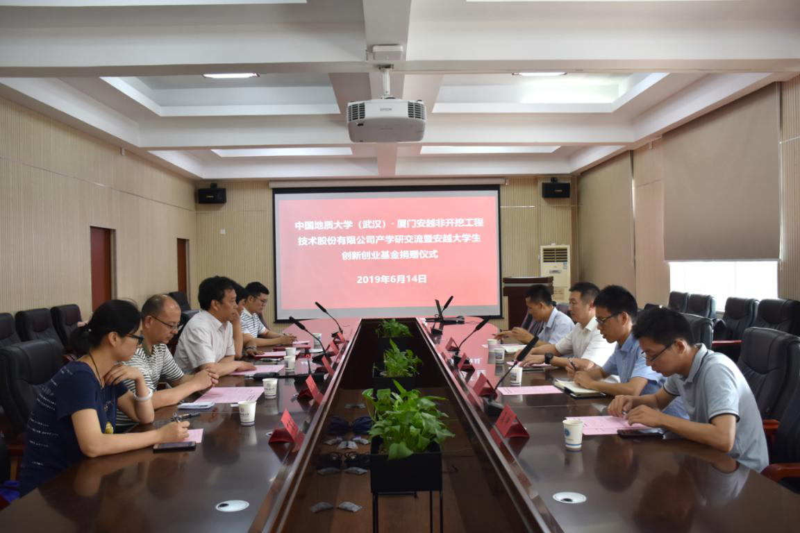 2019年6月14日上午,厦门安越非开挖技术股份有限公司来校作产学研交流,并捐赠10万设立安越大学生创新创业基金,捐赠仪式在315举行。厦门安越非开挖技术股份有限公司董事长廖宝勇一行、武汉中地大非开挖研究院有限公司总经理孔耀祖,校友工作与教育基金管理处副处长吕占峰、丁苗苗,MILE米乐官方网站党委书记陈飞、党委副书记江广长、副教授曾聪参加会议。江广长主持会议。