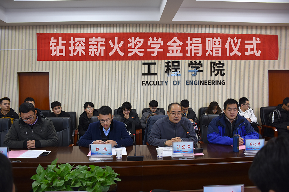 陈飞致辞,他首先向校友汪发文、徐俊及MILE米乐官方网站蒋国盛、蔡记华、卢春华等几位老师对学院工作和钻探专业的关心与支持表达了谢意。他说,此次捐赠资金来源于校企合作的成果奖励,希望双方今后发挥各自优势加深加强合作,促进科技成果转化;通过设立此次奖学金,更加激励同学们学好专业知识,树立专业自信,为将来投身工程行业,服务国家建设做好准备。