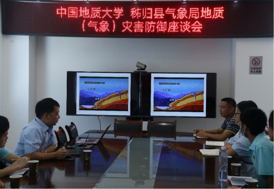 之后,李长冬教授带领社会实践团前往秭归气象局开展了地质(气象)灾害防御座谈会,与秭归气象局台长何满等深入讨论了气象条件对地质灾害的影响。下午,团队与自然资源和规划局挂职副局长邓茂林和茅坪国土资源所所长梅海全等前往茅坪镇兰陵溪村接江坡等滑坡点进行了实地调查,与秭归县自然资源和规划局副局长谭宏等有关领导开展了座谈交流,就依托地大学科平台在秭归未来地质灾害防治工作中开展产学研深度合作达成了共识。