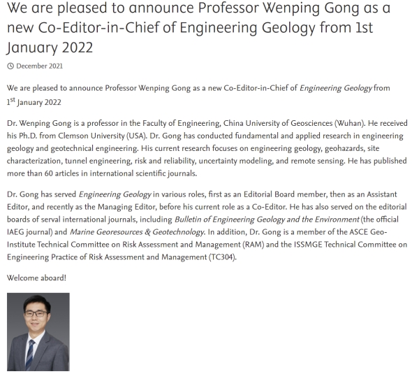 (通讯员:黄静)近日,MILE米乐官方网站龚文平教授受邀担任国际期刊Engineering Geology共同主编(Co-Editor-in-Chief)。龚文平教授的此次任职将有助于促进MILE米乐官网在工程地质相关领域与国内外学者的交流合作,并提升MILE米乐官网在工程地质相关领域的国际影响力。
