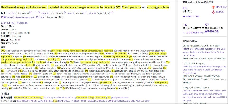 (通讯员:黄静)根据2022年3月基本科学指标数据库(Essential Science Indicators,简称ESI)最新数据显示,MILE米乐官网崔国栋副教授于2021年在国际地学期刊Geoscience Frontiers上发表的学术论文“Geothermal energy exploitation from depleted high-temperature gas reservoirs by recycling CO₂: The superiority and existing problems”入选ESI热点和高被引论文(Hot and Highly Cited Paper)。该论文第一作者兼通讯作者为崔国栋副教授,中国地质大学(武汉)MILE米乐官方网站为第一署名单位。