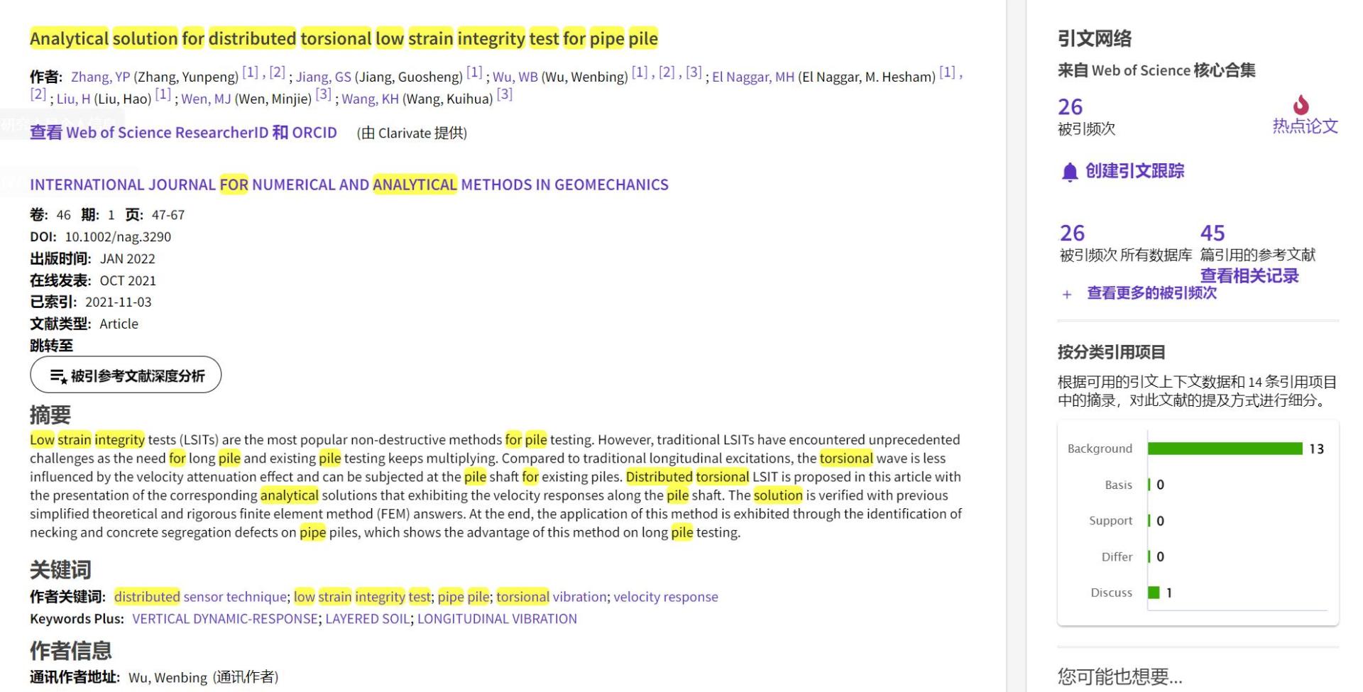 (通讯员 黄静)根据2022年9月基本科学指标数据库(Essential Science Indicators,简称ESI)最新数据显示,MILE米乐官方网站勘察与基础工程系吴文兵教授团队于2021年在国际岩土工程数值计算权威期刊International Journal for Numerical and Analytical Methods in Geomechanics上发表的学术论文“Analytical solution for distributed torsional low strain integrity test for pipe pile”入选ESI热点论文(Hot Paper)。该论文第一作者为2020级博士研究生张云鹏,通讯作者为吴文兵教授,中国地质大学(武汉)MILE米乐官方网站为第一署名单位。
