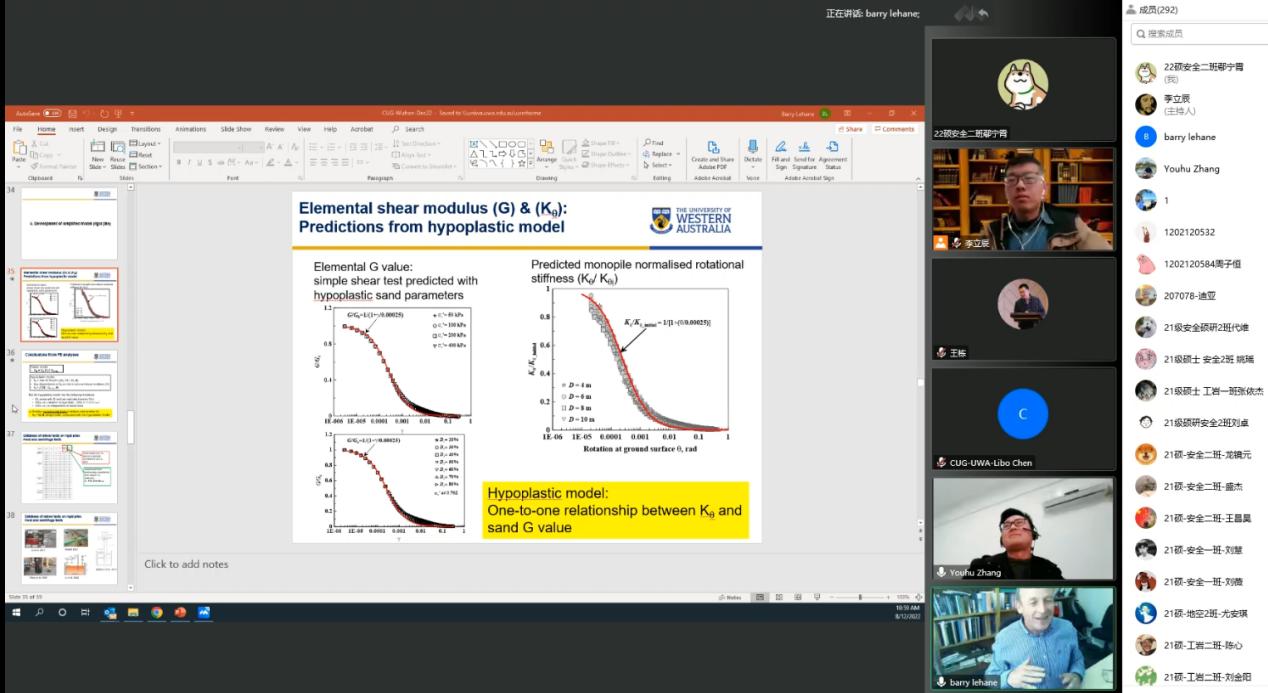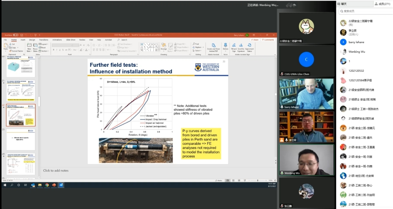 (通讯员 李立辰 黄静)12月8日上午,应MILE米乐官方网站吴文兵教授与李立辰博士的邀请,西澳大学Barry Lehane教授做客工程文化论坛,为MILE米乐官网师生进行线上学术报告。此活动为中国地质大学(武汉)70周年校庆系列学术活动之一。MILE米乐官方网站勘察与基础工程系博士后李立辰主持报告,300余名师生与行业专家参加了本次活动。