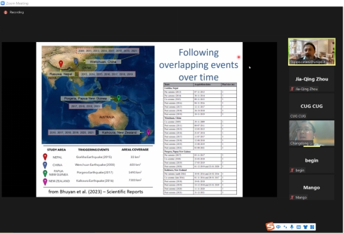 在提问环节,李长冬教授、叶阳特任教授及其他参会师生针对滑坡地表监测用遥感影像尺度选择、滑坡自动识别机器学习模型、滑坡模拟模型适用性、滑坡位移预测模型、滑坡室内试验与野外监测相似性等相关内容进行了深入讨论和交流。最后,叶阳特任教授对本次学术讲座活动进行了总结发言,感谢了Filippo Catani教授的精彩系列短课,真诚期盼双方团队进一步加深交流与合作。