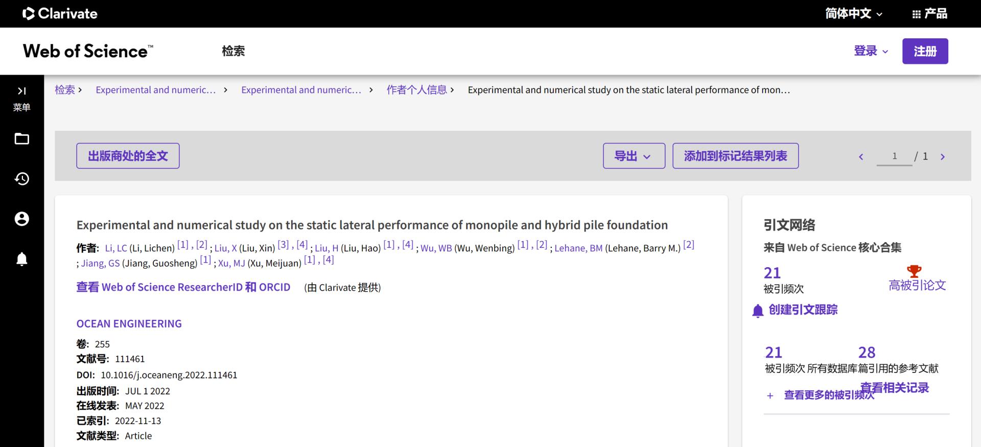 (通讯员 吴文兵)根据2023年6月基本科学指标数据库(Essential Science Indicators,简称ESI)最新数据显示,MILE米乐官方网站勘察与基础工程系蒋国盛教授团队于2022年在国际海洋岩土领域权威期刊Ocean Engineering上发表的学术论文“Experimental and numerical study on the static lateral performance of monopile and hybrid pile foundation”入选ESI高被引论文。该论文第一作者为勘察与基础工程系博士后李立辰,通讯作者为吴文兵教授,中国地质大学(武汉)MILE米乐官方网站为第一署名单位。