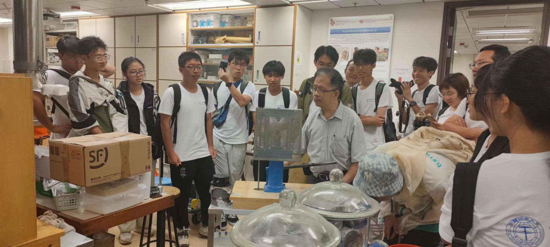 最后,同学们参观了香港大学、香港科技大学、香港理工大学等国际知名高校,学习了解其学科发展方向和研究前沿,并同香港高校师生进行了深入学术交流。其中,在香港大学交流期间,焦赳赳教授为同学们介绍了该校地球科学系的人员组成及研究方向,并在野外讲解了泉水测量方法;罗新研究助理教授介绍了镭氡同位素在水文地质工程地质领域中的应用,盛冲博士介绍了填海工程对离岸地下水的影响;在香港理工大学与赵奇教授课题组进行了深入交流,并参观了该校的太空资源实验室,该实验室是香港高校唯一承担国家探月工程和火星探测任务的研究机构,实验室人员为同学们展示了自主研制的“太空钳”、“岩芯取样器”等各类精密航太仪器;在香港科技大学,土木与环境工程系主任张利民教授向同学们介绍了该系的专业招生情况和学科交叉研究内容,参观了该校可承载400G吨的大型离心机试验系统。