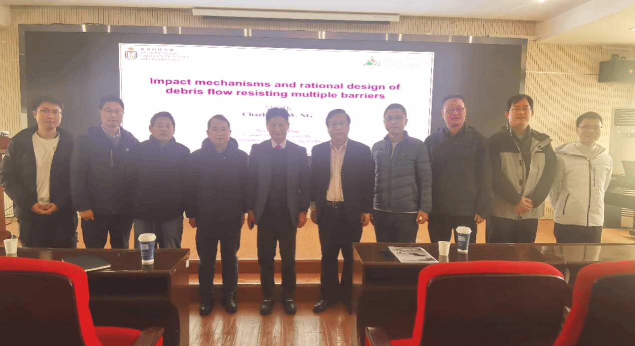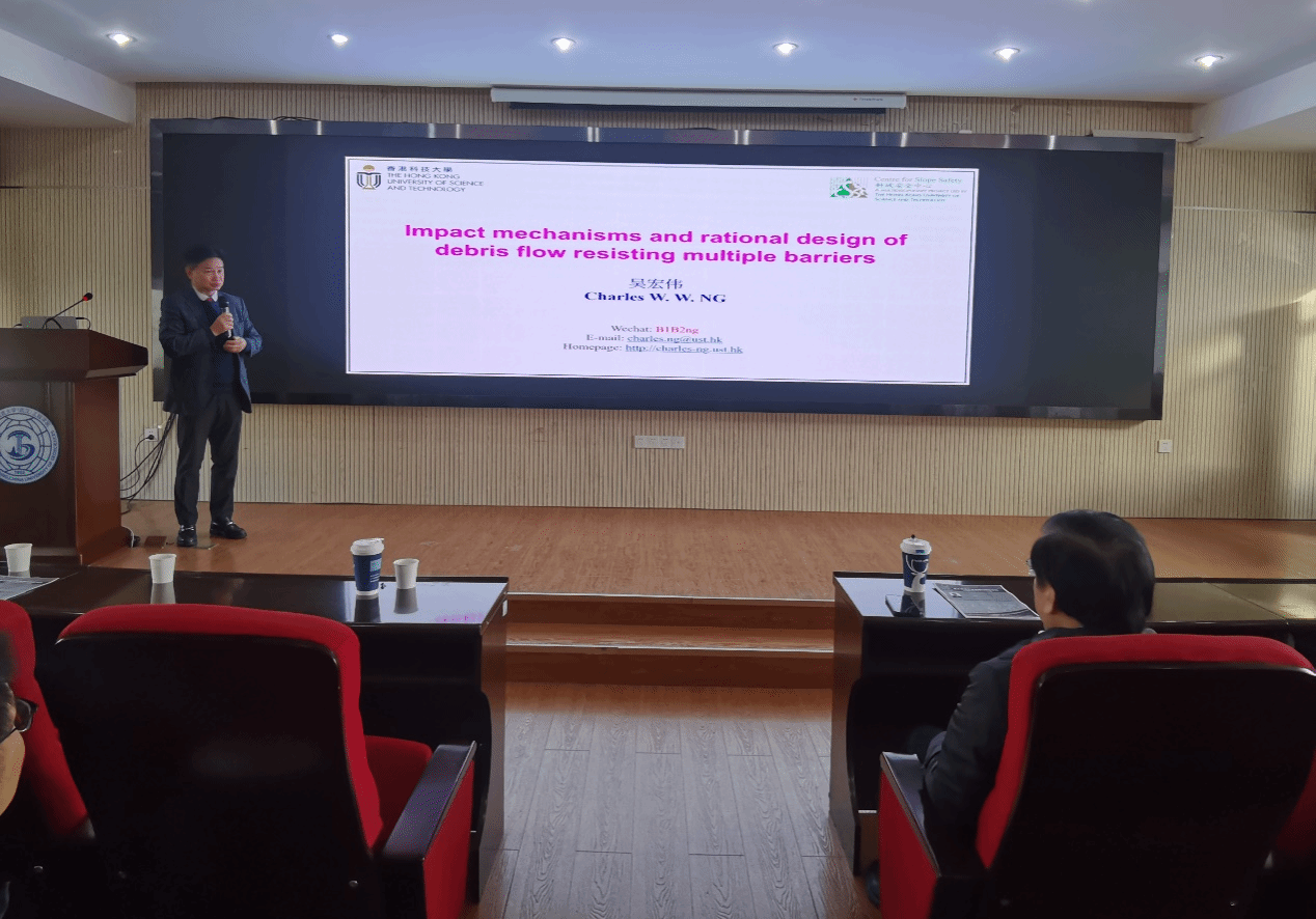 吴宏伟教授作了题为“Impact mechanisms and rational design of debris flow resisting mutltiple barriers”的学术讲座。吴宏伟教授首先介绍了香港科技大学的学科发展历史及国际排名等相关情况,欢迎MILE米乐官网同学前往香港科技大学进行联合培养,开展学术交流活动。随后,介绍其团队近年来在泥石流刚性和柔性屏障设计方面的水槽模型测试和数值模拟试验成果,揭示了典型泥石流对多重屏障的影响机制,为泥石流多重屏障设计提出合理建议。