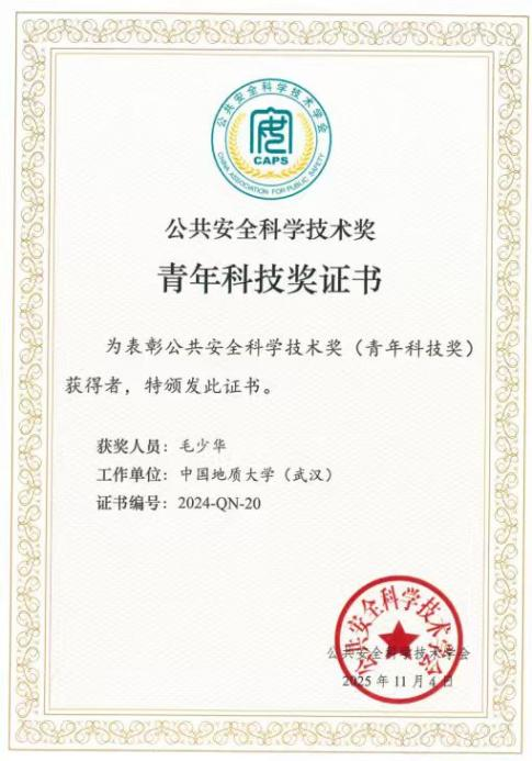 毛少华,研究员,博士生导师,中国地质大学(武汉)先进技术研究院副院长(挂职),中央高校优秀青年团队负责人。主要从事大型船舶火灾防治关键技术研究,相关成果在我国多个舰船重点型号上应用。主持国家自然科学基金面上/青年项目、国家重点研发计划子课题等纵向项目7项,重点型号配套科研项目21项;编写军用标准5项,国防科技报告6篇;获2024 公共安全科学技术奖青年科技奖,2023年度湖北省科学技术奖三等奖1项(R1),2022年公共安全学会科技进步二等奖(R1),中国航海学会科学技术二等奖 1 项(R5);担任Fire、Frontiers in Heat and Mass Transfer等期刊客座主编,《中国舰船研究》和《安全与环境工程》期刊青年编委。担任国防科技工业安全生产标准化技术委员会委员、湖北省住建厅科技委委员、公共安全科学技术学会消防安全分会委员、中国消防协会科普教育委员会委员。