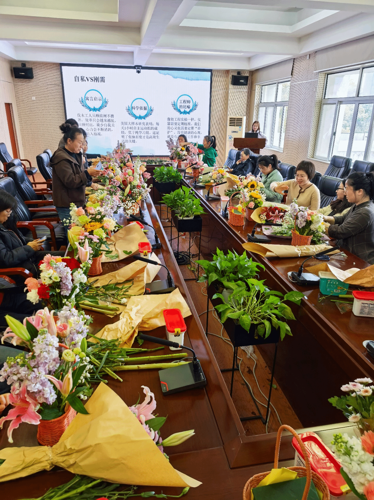 随后进行的插花活动充满了温馨与创意。女教师们围坐在一起,根据自己的审美喜好,在花艺师指导下修枝剪叶、构思层次。将百合定位为视觉焦点,用满天星勾勒出朦胧边界。女教师们在互相交流插花心得,分享配色灵感的同时,也将自己的花材分给邻座。剪刀轻响间,花材被赋予独特灵魂,手机镜头记录下一个个创意花篮,更定格了彼此分享花材、交流经验的暖心画面。