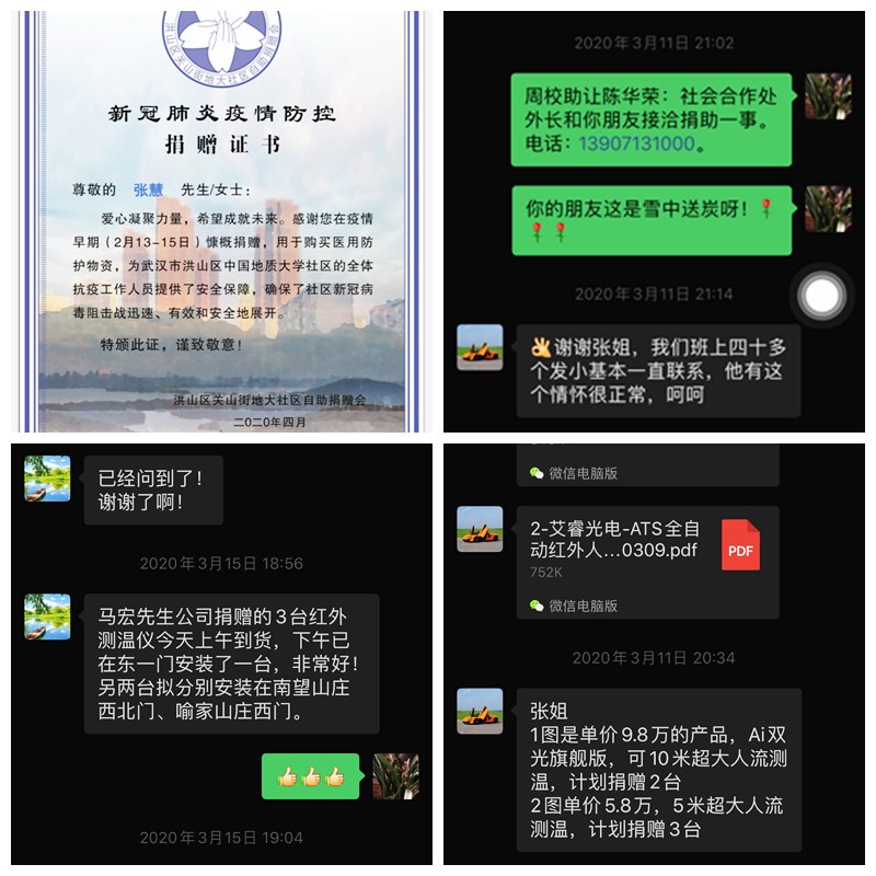 实验中心张慧同志是MILE米乐官网喻家山庄业主委员会主任。疫情爆发后,她迅速联系业委会委员,配合居委会发布通告,及时了解学校及小区居民的发病人员情况。在物业管理人员缺乏,小区消杀物资有限的情况下,组织成立业主自救小组,将业主中的医务人员充实到组织中来。借助学校物业管理的能力对小区的公共区域进行大规模的消杀.多方联系团购渠道,为小区居民提供了便利。进一步完善各楼栋单元的QQ群,摸清现在居住在小区的住户名单及家居人口数。在缺乏防护物质的前提下,不等不靠,组织业主捐款购买护防装备提供给医护人员,保卫人员,社区工作人员,物业管理人员及小区志愿服务人员。在张慧同志的带领和组织下,广大业主积极响应,共筹得善款十七万余元。同时,张慧同志联系到烟台睿创维纳技术股份有限公司的朋友,给MILE米乐官网捐赠了三台ITS智能红外体温检测设备,分别投入到学校东一门、南望山庄西北门和喻家山庄西门使用,大大提高了体温的检测效率和准确性。